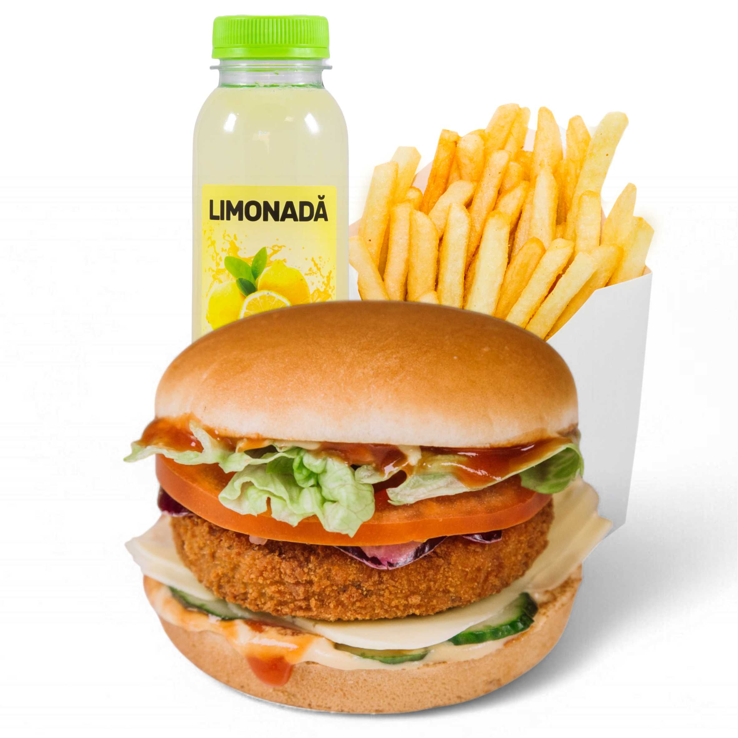 Ingrediente: Vegi Mo’s Burger 250 g + cartofi prajiti 120 g + O bautura la alegere: Limonada, Socata, Apa, Suc (330/400/500ml)