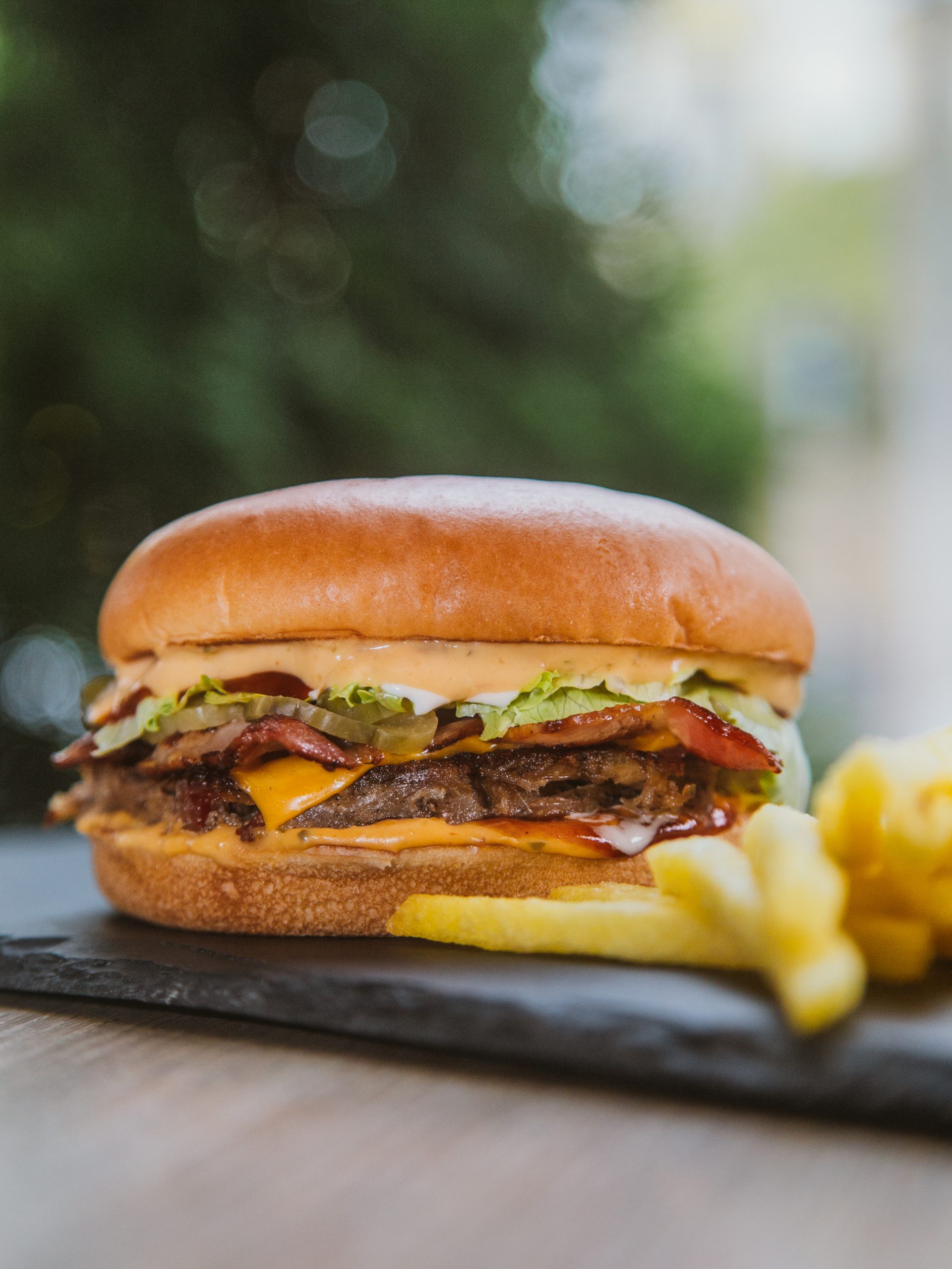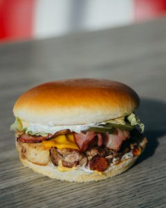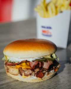 Piggy 280g, facut din ceafa de porc și carnati picanti – din carmangeria proprie, bacon, branza Cheddar, salata Iceberg, castraveti murati, sos Mo’s, sos BBQ, totul intr-o chifla de burger.