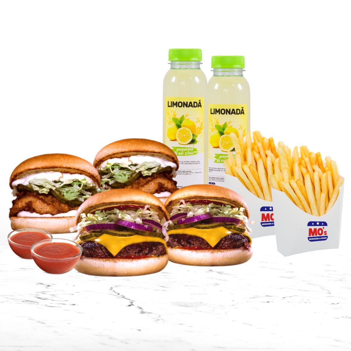 Ingrediente: 2 burgeri Classic One Chicken (2x175g) + 2 burgeri Classic One Beef (2x200g) + 2 portii de cartofi prajiti (2x120g)+ 2 sosuri la alegere (2×20/40g) + 2 băuturi răcoritoare la alegere: Limonada, Socata, Apa, Suc (330/400/500ml)